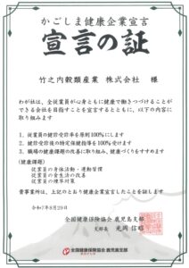 このたび、竹之内穀類産業株式会社では従業員皆が心身ともに健康でいつづけることを目指すため、「かごしま健康企業宣言」を宣言いたしました。