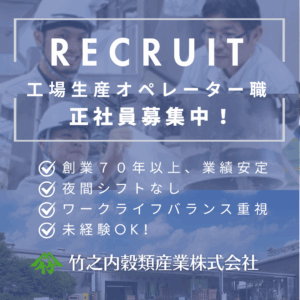 竹之内穀類産業株式会社では穀類加工工場の生産オペレーターを募集中です。